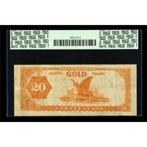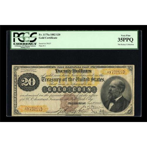 <B>Fr. 1175a $20 1882 Gold Certificate PCGS Very Fine 35PPQ.</B></I> Current census figures indicate a little more than two dozen examples of this issue are known, and this attractively original note clearly ranks in the top five or six notes for condition. We were privileged to handle this condition-census rarity in our January 1999 Auction where it was listed as About Extremely Fine with the following description, "this beautiful note from Dr. Cookson's spectacular collection is reaching the auction block for the first time. It's 100% original, with perfect surfaces, bright colors, and excellent margins." Our grade then and the PCGS grade today agree as we both clearly think this note is as nice as one will find for the grade. When the hammer drops, this condition census note will be a deal compared to the lone CU that sold for $138,000 in our September 2006 Signature Auction.<BR><BR><b>Shipping:</b> Coins & Currency (<a target="_blank" href="http://www.heritageauctions.com/common/shipping.php">view shipping information</a>)