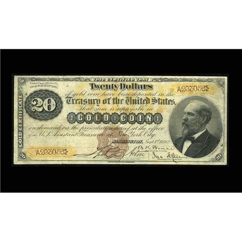 <B>Fr. 1175a $20 1882 Gold Certificate Very Fine.</B></I> Full margins, sound edges, and good color go hand in hand with this nice mid-grade note from one of the heralded issues in United States paper money. This is one of two dozen serial numbers reported in the census, with this much-in-demand variety having the engraved countersignature of Thomas C. Acton. The note is purely natural, without so much of a hint of a repair or restoration of any kind. A wholly pleasing note that any collector of circulated type would be proud to acquire.