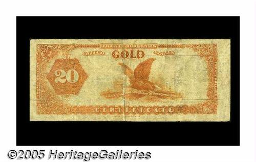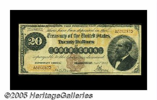 <B>Fr. 1176 $20 1882 Gold Certificate Fine-Very Fine.</B></I> <B>Fr. 1176 $20 1882 Gold Certificate Fine-Very Fine.</B></I> The full census for this number is 20 pieces, several of which are permanently impounded. We've handled only three, two Very Goods and an About New which realized $11,000 in 1999. The note has retained excellent color, giving the appearance of a full Very Fine from the face, although the brightly colored back shows a touch more wear. There is also a very tiny split at the top center. A rare note that will attract multiple bids and will likely go home with a new collector in the range of . . .