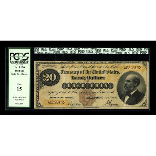<B>Fr. 1176 $20 1882 Gold Certificate PCGS Fine 15.</B></I> The full census for this number is 20 pieces, several of which are permanently impounded. The note has retained excellent color, giving the appearance of a full Very Fine from the face, although the brightly colored back shows a touch more wear. There is also a very tiny split at the top center. A rare note that will attract multiple bids and will likely go home with a new collector in the range of . . .<BR><BR><b>Shipping:</b> Coins & Currency (<a target="_blank" href="http://www.heritageauctions.com/common/shipping.php">view shipping information</a>)