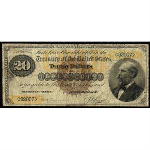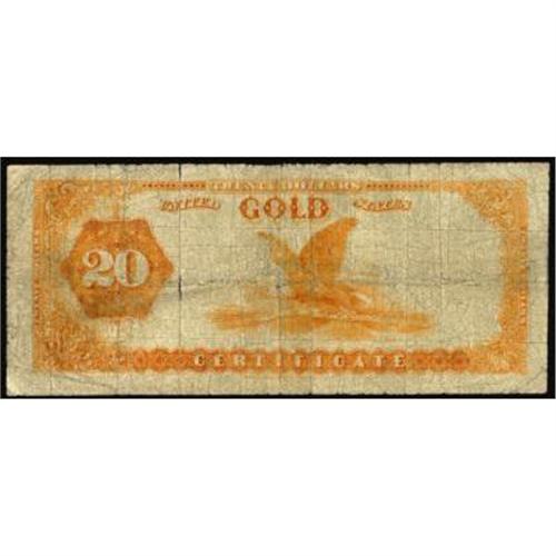 <style type="text/css"> body, td, th { font-family: Arial, Helvetica, sans-serif; font-size: 12px; color: #482424; margin: 0px; padding: 0px; } #header { background-image: url(http://www.bowersandmerena.com/ebay/images/template_v3_01.gif); clear: both; background-color: #590303; border-top-width: 2px; border-top-style: solid; border-top-color: #B38C4F;}#header #header_wrapper { height: 75px; clear: both; width: 800px; margin-right: auto; margin-left: auto; background-image: url(http://www.bowersandmerena.com/ebay/images/template_v3_03.gif); background-repeat: no-repeat; background-position: right; color: #F3EDCC;}#header #header_wrapper #header_logo { float: left; height: 75px; width: 444px; background-image: url(http://www.bowersandmerena.com/ebay/images/template_v3_02.gif); background-repeat: no-repeat; font-size: 10px; text-transform: capitalize; color: #B38C4F;}#header #header_wrapper #header_right { float: left; height: 75px; width: 356px; text-align: right;}#header #header_wrapper #header_right #headerLoginBtn { margin-bottom: 30px;}#header #header_wrapper #header_right input#txtSearch { color: #B49056; border: 1px solid #B49056; width: 175px; padding-top: 3px; padding-right: 3px; padding-bottom: 4px; padding-left: 3px;}#nav { height: 37px; background-image: url(http://www.bowersandmerena.com/ebay/images/template_v3_05.gif); clear: both;}#nav #nav_wrapper { height: 35px; width: 800px; margin-right: auto; margin-left: auto; border-left-width: 1px; border-left-style: solid; border-left-color: #B38C4F;}#nav #nav_wrapper a { padding-right: 15px; padding-left: 15px; border-right-width: 1px; border-right-style: solid; border-right-color: #B38C4F; height: 25px; padding-top: 10px; display: block; float: left; text-decoration: none; font-weight: bold; color: #5D0303;}#nav #nav_wrapper a:hover { color: #B38C4F;}#nav #nav_wrapper #search { float: right; padding-top: 7px;}#nav #nav_wrapper #search #txtSearch { font-family: Arial, Helvetica, sans-serif; font-size: 10px; text-transform: uppercase; color: #D2AE75; border: 1px solid #B38C4F; padding: 3px;}#content_bgd { background-image: url(http://www.bowersandmerena.com/ebay/images/template_v3_09.gif); background-repeat: repeat-y; background-position: center; padding-top: 15px; padding-bottom: 15px; background-color: #FBFBDB;}#content_wrapper { clear: both; height: auto; width: 800px; margin-right: auto; margin-left: auto;}.LotDetailWhite{ line-height:normal; font-size:13px; font-family: arial,helvetica,sans-serif; color: White; font-weight: bold;}.LotDetailInformation{ line-height:normal; font-size: 13px; font-family: arial,helvetica,sans-serif;}.LotDetailMessage{ line-height:normal; font-size: 13px; font-family: arial,helvetica,sans-serif; color: red;}}tr.HeaderAuctionTitle td { color: #000000; font-weight: bold; padding: 2px; background-image: url(http://www.bowersandmerena.com/ebay/images/template_v3_05.gif); background-repeat: repeat-x; border-bottom-width: 1px; border-bottom-style: solid; border-bottom-color: #B38C4F;}table.AuctionSummary a, table.AuctionSummary a:link, table.AuctionSummary a:visited { color: #0000FF; text-decoration: none;}}td.tableHeaderLeft { border-left-width: 1px; border-left-style: solid; border-left-color: #B38C4F;}td.tableHeaderRight { border-right-width: 1px; border-right-style: solid; border-right-color: #B38C4F;}td.tableCellMiddle { border-left-width: 1px; border-left-style: solid; border-left-color: #B38C4F; border-right-width: 1px; border-right-style: solid; border-right-color: #B38C4F; padding: 5px;}tr.footer td { border-top-width: 1px; border-top-style: solid; border-top-color: #B38C4F;}</style></head><body><div id="header"> <div id="header_wrapper"> <div id="header_logo"> </div> <div id="header_right"> </div> </div></div><div id="nav"> <div id="nav_wrapper"> <a href="http://www.bowersandmerena.com">Our eBayLive Auctions</a> <a href="#PaymentInfo">Payment Information</a> <a href="#ShippingInfo">Shipping Information</a> <a href="#About">About Bowers and Merena</a> </div></div><div id="content_bgd"> <div id="content_wrapper"> <table width="100%" border="0" cellpadding="5" cellspacing="0" class="AuctionSummary"> <tbody> <tr class="HeaderAuctionTitle" style="height: 25px;"> <td align="left" class="tableHeaderLeft" > </td> <td align="center" class="tableHeaderRight"> <span style="font-size: large;">Lot #116. Fr. 1177. 1882 $20 Gold Certificate. Very Good.</span> </td> </tr> <tr> <td colspan="3" class="tableCellMiddle"> A new addition to the census, making just 30 pieces now documented as extant. Our offering tonight is at the lower end of the condition spectrum and should be available at a price level far more affordable than its more well preserved counterparts. A bit of margin roughness at top and several pinholes, as well as a somewhat heavier fold to the left of President Garfield's portrait are quite consistent with the assigned grade. Est. $1,000 - $1,500