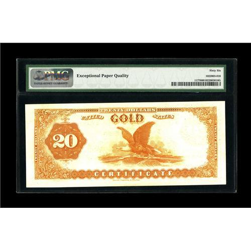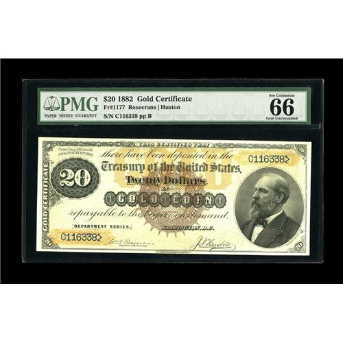 <B>Fr. 1177 $20 1882 Gold Certificate PMG Gem Uncirculated 66 EPQ.</B></I> One of only two available CU examples with the other permanently impounded in the ANA Museum courtesy of Aubrey Beebe. Formerly in "The Fantastic Collection" it took four decades for this note to reach the market. It realized $35,000+ on an estimate of $20,000 and up in CAA's auction of May 1998. The next highest graded note is an AU which CAA sold in 1997 that has been off the market since then. To paraphrase CAA's description then, this Gem New could not be surpassed. The margins are broad and even, the color 100% perfect, and the surfaces simply flawless. The combination of grade and rarity delivers the finest known. PMG has certainly delivered on our expectations in this case. With the current market focused on the rarest and the best, there should be no doubt that this may become a six figure piece. Expect a realization in the area of... .<BR><BR><b>Shipping:</b> Coin/Currency (<a target="_blank" href="http://www.heritageauctions.com/common/shipping.php">view shipping information</a>)