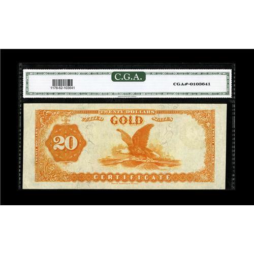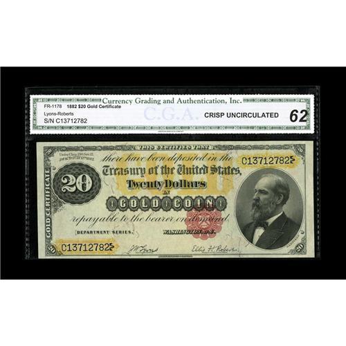 <B>Fr. 1178 $20 1882 Gold Certificate CGA Crisp Uncirculated 62.</B></I> A well centered 1882 Gold Certificate that would likely have earned a higher certification but for the presence of several light corner folds. A note likely to sell at a level higher than its technical grade might imply due to its superior overall eye appeal. The often faded gold colored back appears to us to be every bit as strong as the day this note left the BEP press. An example that merits a strong bid.<BR><BR><b>Shipping:</b> Coin/Currency (<a target="_blank" href="http://www.heritageauctions.com/common/shipping.php">view shipping information</a>)