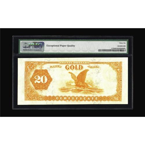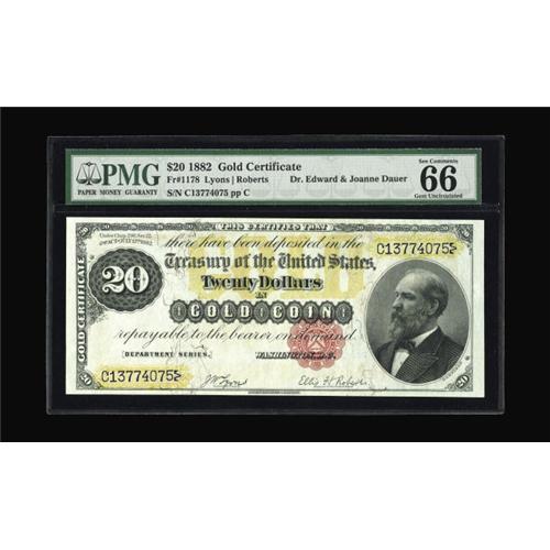<B>Fr. 1178 $20 1882 Gold Certificate PMG Gem Uncirculated 66 EPQ.</B></I> Prior to submitting these notes to PMG, several of us in the Heritage office wrote down our own grade opinions. As would be expected, the PMG grades were a mixture of a point high, a point low...but most were right in line with our own grades. This note, which is graded 66 EPQ, had been picked as 67 or 68 by all of us. This is not to say that we were right and they were wrong; but just to point out that our belief is that this $20 Gold, in spite of its high 66 EPQ grade, appears to us to be graded quite conservatively. The color, margins, original paper surfaces and everything else about this note are simply spectacular. It is plated on page 298 of the Dauers' fine book.<BR><I>From The Dr. Edward and Joanne Dauer Collection</B></I>