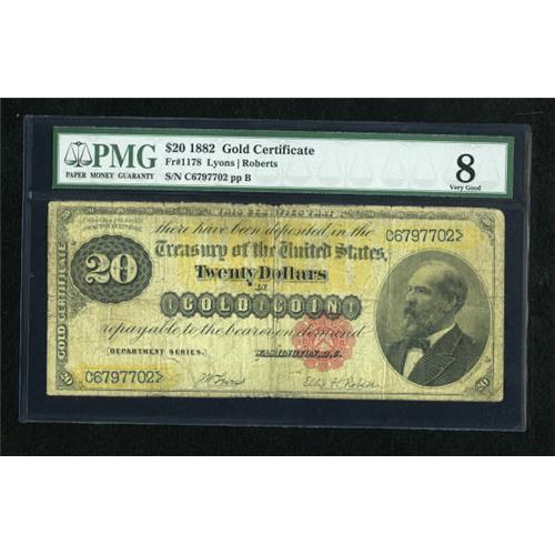 <B>Fr. 1178 $20 1882 Gold Certificate PMG Very Good 8.</B></I> There are some minor edge problems, but the overall color on the face is decent.<BR><I>From The Amelia Island Collection</B></I><BR><BR><b>Shipping:</b> Coins & Currency (<a target="_blank" href="http://www.heritageauctions.com/common/shipping.php">view shipping information</a>)