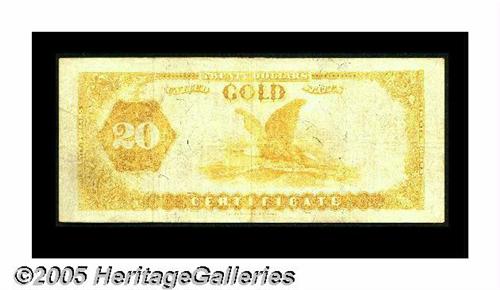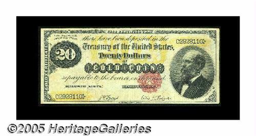 <B>Fr. 1178 $20 1882 Gold Certificate Very Fine.</B></I> An attractive face with weak back color define this $20 that has a couple of minute apertures.