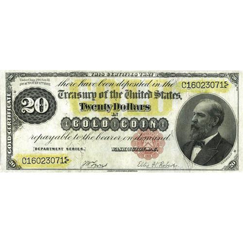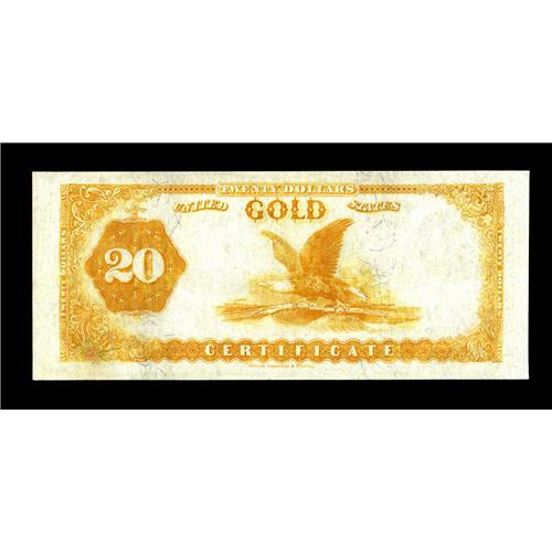 <B>Fr. 1178 $20 1882 Gold Certificate Very Fine+.</B></I> Though this note may have been wet at one time, the color, front, and back remains vivid and most appealing.