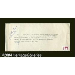 32A. A MEMORABILIA lot (Autographs, Sports Collectibles, or Music, Entertainment, Political, Americana and/or Pop Culture memorabilia) when the lot is accompanied by a Certificate of Authenticity, or its equivalent, from an independent third party authentication provider, has no right of return. Under extremely limited circumstances, not including authenticity (e.g. gross cataloging error), a purchaser, who did not bid from the floor, may request Auctioneer to void a sale. Such request for evaluation must be made in writing detailing the alleged gross error, and submission of the lot to the Auctioneer must be pre-approved by the Auctioneer. A bidder must notify the appropriate department head (check the inside front cover of the catalog or our website for a listing of department heads) in writing of the purchaser's request and such notice must be mailed within three (3) days of the mail bidder's receipt of the lot. Any lot that is to be evaluated for return must be received in our offices with 30 days. AFTER THAT 30 DAY PERIOD, NO LOT MAY BE RETURNED FOR ANY REASONS. Lots returned must be in the same condition as when sold and must include the Certificate of Authenticity, if any. No lots purchased by floor bidders may be returned (including those bidders acting as agents for others). Late remittance for purchases may be considered just cause to revoke all return privileges.