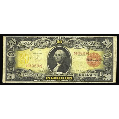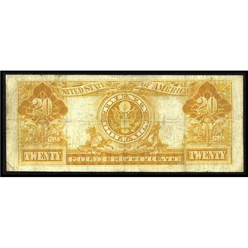 <B>Fr. 1179 $20 1905 Gold Certificate Fine+.</B></I> The colors on the face and back are beautiful on this well margined Technicolor $20. Usually the back loses much of its color on this issue, but not in this case. There is a fair amount of embossing remaining with a few pinholes which are more noticeable on the back.
