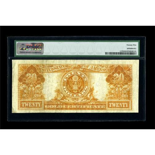 <B>Fr. 1179 $20 1905 Gold Certificate PMG Very Fine 25.</B></I> A very difficult note to find in this grade, particularly when certified by PMG or PCGS. PMG, for example, has only graded fifteen Fr. 1179s in all grades combined. Solid margins are seen on this nice mid-grade note. <B><BR></B></I><I>From The Drew Keough Collection</B></I><BR><BR><b>Shipping:</b> Coins & Currency (<a target="_blank" href="http://www.heritageauctions.com/common/shipping.php">view shipping information</a>)