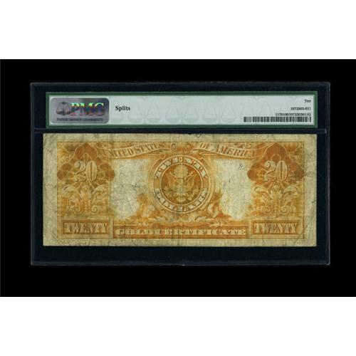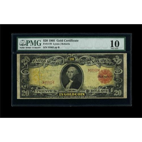 <B>Fr. 1179 $20 1905 Gold Certificate PMG Very Good 10.</B></I> PMG mentions splits on this still colorful "Technicolor."<BR><BR><b>Shipping:</b> Coins & Currency (<a target="_blank" href="http://www.heritageauctions.com/common/shipping.php">view shipping information</a>)