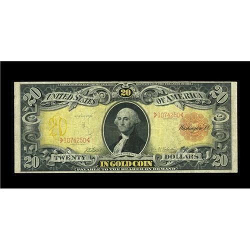 <B>Fr. 1179 $20 1905 Gold Certificate Very Good-Fine.</B></I> The back has faded from orange to brown on this Technicolor that still has strong colors on the front. The paper remains firm and the margins are missing any serious issues.<BR><BR><b>Shipping:</b> Coin/Currency (<a target="_blank" href="http://www.heritageauctions.com/common/shipping.php">view shipping information</a>)