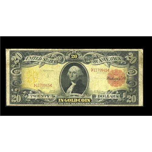 <B>Fr. 1179 $20 1905 Gold Certificate Very Good-Fine.</B></I> This Technicolor Twenty has retained considerably more color than one would expect for the grade. Five pinholes are also noted.
