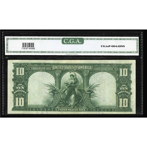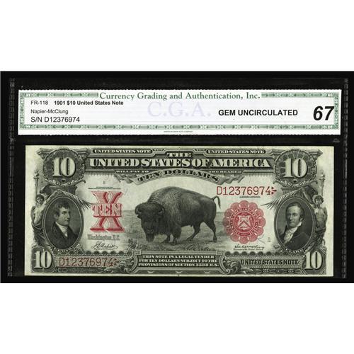 <B>Fr. 118 $10 1901 Legal Tender CGA Gem Uncirculated 67.</B></I> A handsome Bison with excellent face margins, a bold red overprint, and razor-sharp print quality on both sides.