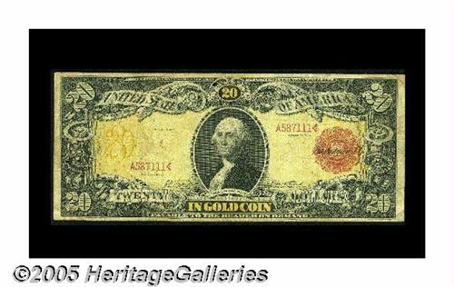 <B>Fr. 1180 $20 1905 Gold Certificate Fine.</B></I> An absolutely ideal example of the grade. This is one of the most popular of the personality notes, and on this type, it's all about the color. For the grade, the color of this piece is super. It's free of flaws, with a bright red seal and serial numbers and with the yellow overprint - which helps give this note its Technicolor nickname - amazingly bold. This outstanding circulated note is also blessed with strong back color, something that is almost never seen on this type. If the grade of Gem Fine existed, this would be that piece.