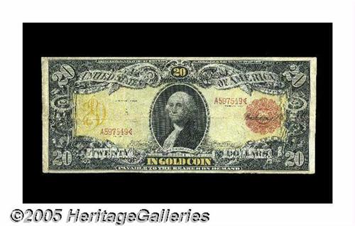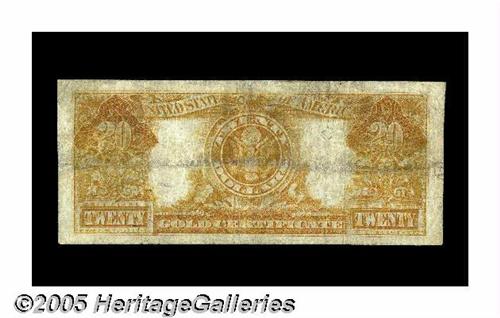<B>Fr. 1180 $20 1905 Gold Certificate Fine.</B></I> This is a snappy Technicolor that has an attractive face with its display of colors, while the back has some soiling along the lateral center fold.
