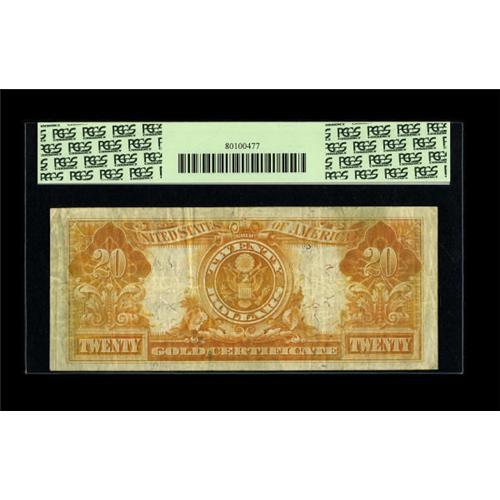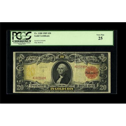 <B>Fr. 1180 $20 1905 Gold Certificate PCGS Very Fine 25.</B></I> The color is terrific as one would expect from a $20 with the nickname "Technicolor". The note is quite clean and, particularly when viewed from the front, appears nicer than the assigned grade would suggest. The last couple of these in a bit higher grade more than doubled their estimate in our Long Beach 2007 sale. Expect a realization in the area of...<BR><BR><b>Shipping:</b> Coins & Currency (<a target="_blank" href="http://www.heritageauctions.com/common/shipping.php">view shipping information</a>)