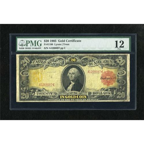 <B>Fr. 1180 $20 1905 Gold Certificate PMG Fine 12.</B></I> The face colors are solid and the note is framed by four full margins.<BR><BR><b>Shipping:</b> Coins & Currency (<a target="_blank" href="http://www.heritageauctions.com/common/shipping.php">view shipping information</a>)