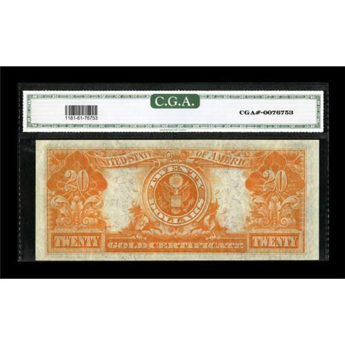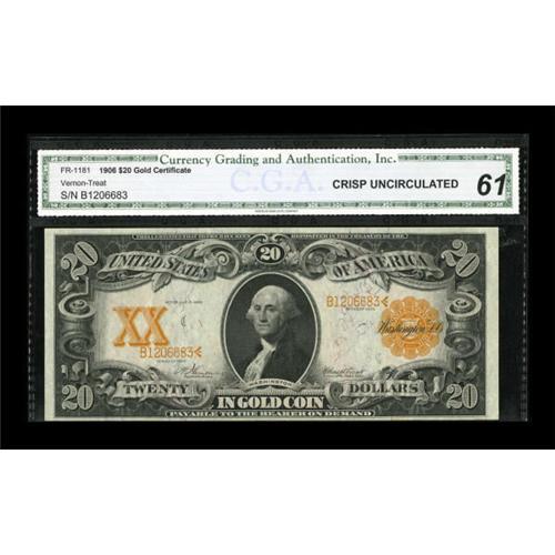 <B>Fr. 1181 $20 1906 Gold Certificate CGA Crisp Uncirculated 61.</B></I> Decently margined with strong colors of the inks and paper. <BR><BR><b>Shipping:</b> Coins & Currency (<a target="_blank" href="http://www.heritageauctions.com/common/shipping.php">view shipping information</a>)