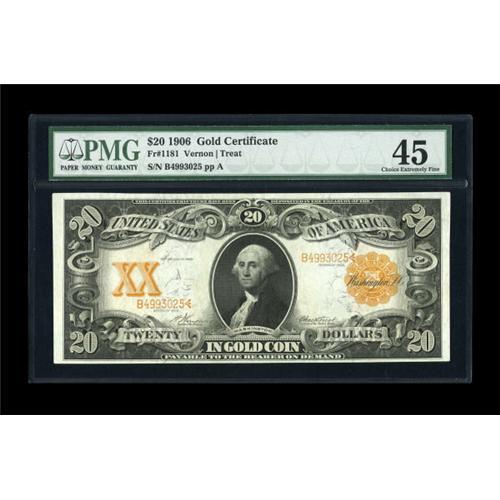 <B>Fr. 1181 $20 1906 Gold Certificate PMG Choice Extremely Fine 45.</B></I> Plenty of eye appeal is noticed on this well margined Gold note.<BR><BR><b>Shipping:</b> Coins & Currency (<a target="_blank" href="http://www.heritageauctions.com/common/shipping.php">view shipping information</a>)