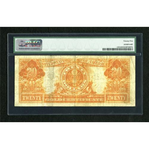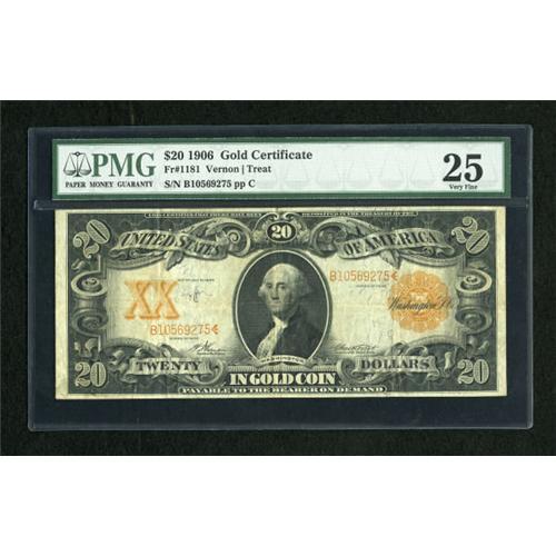 <B>Fr. 1181 $20 1906 Gold Certificate PMG Very Fine 25.</B></I> Solid margins are noted on this scarce $20 gold. The back is sufficiently bright adding to the overall eye appeal.<BR><BR><b>Shipping:</b> Coins & Currency (<a target="_blank" href="http://www.heritageauctions.com/common/shipping.php">view shipping information</a>)