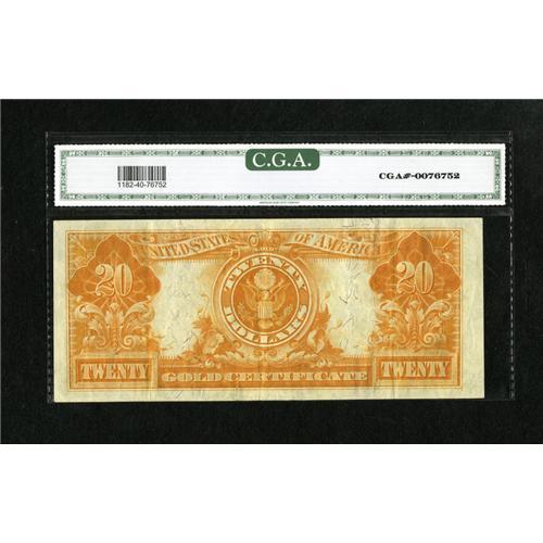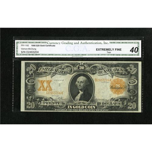 <B>Fr. 1182 $20 1906 Gold Certificate CGA Extremely Fine 40.</B></I> Most of the surviving Friedberg 1182's have seen moderate to excessive amounts of wear. This note did not avoid the same fate though the colors are still bold. A tear which is visible in the bottom margin is notated as such on the holder.<BR><I>From The Collection of Greg Southward</B></I><BR><BR><b>Shipping:</b> Coins & Currency (<a target="_blank" href="http://www.heritageauctions.com/common/shipping.php">view shipping information</a>)