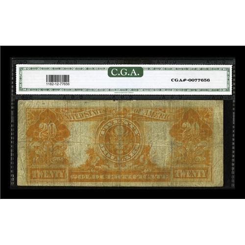 <B>Fr. 1182 $20 1906 Gold Certificate CGA Fine 12.</B></I> Well margined and correctly graded though a pinhole in the portrait must be mentioned for the sake of internet bidders.