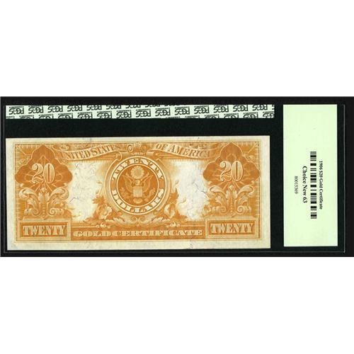 <B>Fr. 1182 $20 1906 Gold Certificate PCGS Choice New 63.</B></I> Last time we sold this note, we graded it Superb Gem and described it: "An absolutely gorgeous example of a very scarce number. Fewer than three dozen Fr. 1182's are known to exist in all grades combined, and it's not at all likely that any of them exceed the appearance and technical merit of this beauty. Its original embossing is present, it's surrounded by broad, even margins, and the note has paper and ink colors the equal of the day it was printed. A wonderful combination of rarity, technical grade, and visual appeal." That was our description the last time we sold this note and its price realized of over $4,000 seemed to agree with our description. PCGS apparently does not. The world is sometimes a cold, cruel place.