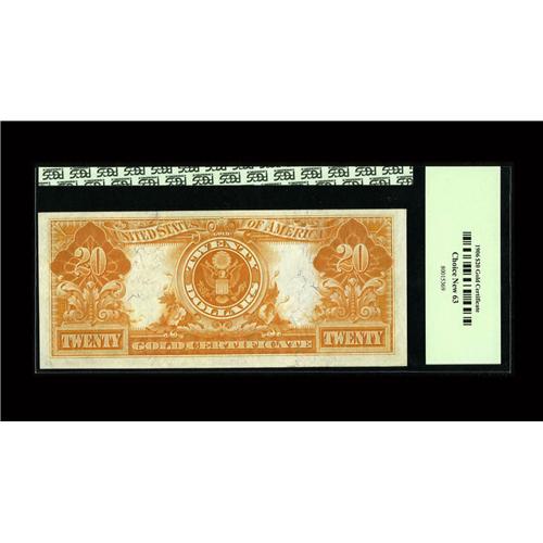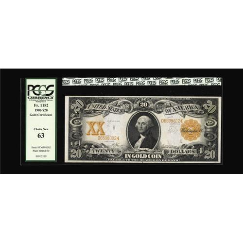 <B>Fr. 1182 $20 1906 Gold Certificate PCGS Choice New 63.</B></I> In our opinion this note may have been a tad conservatively graded. Last time we sold this note, we graded it Superb Gem and described it: "An absolutely gorgeous example of a very scarce number. Fewer than three dozen Fr. 1182's are known to exist in all grades combined, and it's not at all likely that any of them exceed the appearance and technical merit of this beauty. Its original embossing is present, it's surrounded by broad, even margins, and the note has paper and ink colors the equal of the day it was printed. A wonderful combination of rarity, technical grade, and visual appeal."