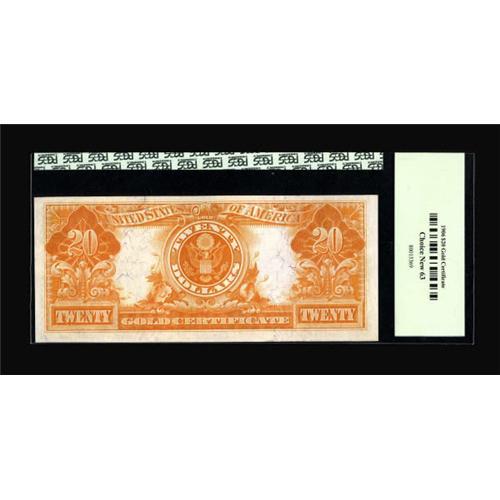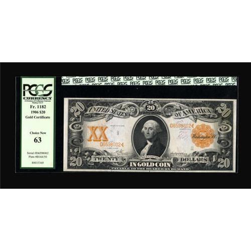 <B>Fr. 1182 $20 1906 Gold Certificate PCGS Choice New 63.</B></I> The first time we had the privilege of selling this bright $20 Gold, we described it as, "An absolutely gorgeous example of a very scarce number. Fewer than three dozen Fr. 1182's are known to exist in all grades combined, and it's not at all likely that any of them exceed the appearance and technical merit of this beauty. Its original embossing is present, it's surrounded by broad, even margins, and the note has paper and ink colors the equal of the day it was printed. A wonderful combination of rarity, technical grade, and visual appeal." It is just as nice today. <BR><BR><b>Shipping:</b> Coins & Currency (<a target="_blank" href="http://www.heritageauctions.com/common/shipping.php">view shipping information</a>)
