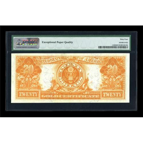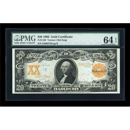 <B>Fr. 1182 $20 1906 Gold Certificate PMG Choice Uncirculated 64 EPQ.</B></I> This is one of the nicest of this scarce Friedberg number that we can recall seeing over the years. The PMG statistics also bear that out as this example is the highest graded note they have seen as of this writing. This $20 Gold has beautiful inks and paper to go along with its nice margins and it has that wonderful combination of rarity, grade, and visual appeal that collectors pursue.<BR><BR><b>Shipping:</b> Coins & Currency (<a target="_blank" href="http://www.heritageauctions.com/common/shipping.php">view shipping information</a>)