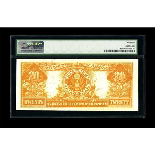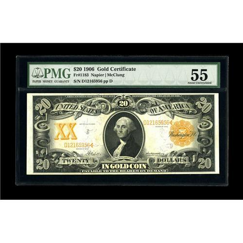 <B>Fr. 1183 $20 1906 Gold Certificate PMG About Uncirculated 55.</B></I> Well balanced margins and eye popping color are the hallmarks of this lovely example. A nice note that will fill the bill for type from this tougher signature combination.<BR><BR><b>Shipping:</b> Coin/Currency (<a target="_blank" href="http://www.heritageauctions.com/common/shipping.php">view shipping information</a>)