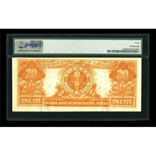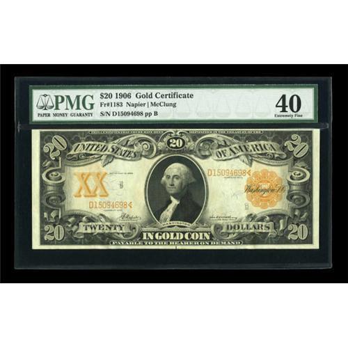 <B>Fr. 1183 $20 1906 Gold Certificate PMG Extremely Fine 40.</B></I> A premium mid-grade example that has the look and appeal of a higher graded note. Bright color and a minimum of folds occupy the lovely surfaces.<B><BR></B></I><I>From The John Ameen Collection<BR></B></I><BR><BR><b>Shipping:</b> Coins & Currency (<a target="_blank" href="http://www.heritageauctions.com/common/shipping.php">view shipping information</a>)