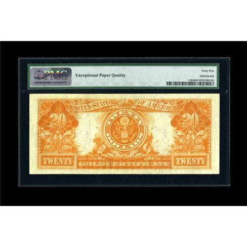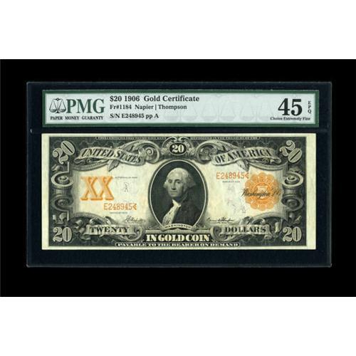<B>Fr. 1184 $20 1906 Gold Certificate PMG Choice Extremely Fine 45 EPQ.</B></I> A center fold is noted on this piece. Unfortunately, handling keeps it from a full AU grade. The colors on front and back remain bold.<BR><BR><b>Shipping:</b> Coins & Currency (<a target="_blank" href="http://www.heritageauctions.com/common/shipping.php">view shipping information</a>)