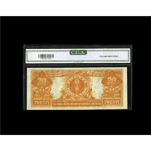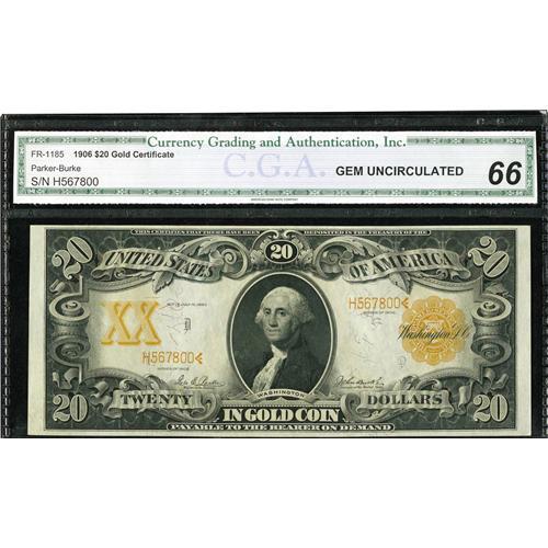 <B>Fr. 1185 $20 1906 Gold Certificate CGA Gem Uncirculated 66.</B></I> Natural paper wave and excellent color are merits of this attractive $20 Gold.