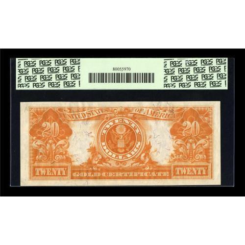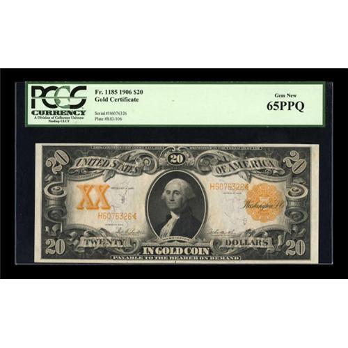 <B>Fr. 1185 $20 1906 Gold Certificate PCGS Gem New 65PPQ.</B></I> One of the prettier examples of this issue that we have offered in some time. Evenly margined and well centered with plenty of in your face embossing visible beneath the encasement.<BR><BR><b>Shipping:</b> Coins & Currency (<a target="_blank" href="http://www.heritageauctions.com/common/shipping.php">view shipping information</a>)