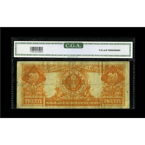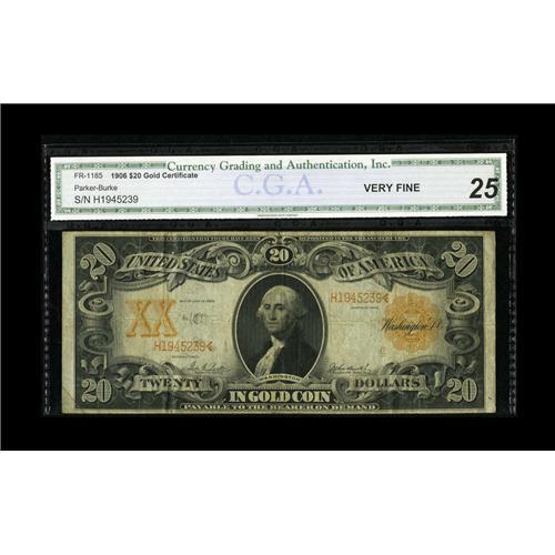 <B>Fr. 1185 $20 1906 Gold Certificate PCGS Very Fine 25.</B></I> This early Double Sawbuck is a bit soiled on the back, but it does little to affect the color underneath.
