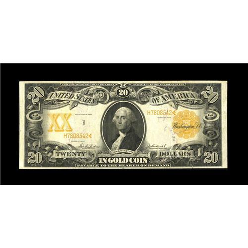 <B>Fr. 1185 $20 1906 Gold Certificate Very Fine.</B></I> Given the amount of circulation this note received, the note still boasts most of its bright overprint. There are two minor edge splits noted at bottom.<BR><BR><b>Shipping:</b> Coin/Currency (<a target="_blank" href="http://www.heritageauctions.com/common/shipping.php">view shipping information</a>)