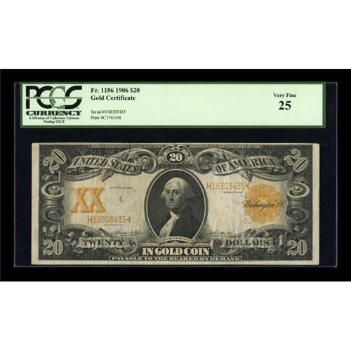 <B>Fr. 1186 $20 1906 Gold Certificate PCGS Very Fine 25.</B></I> Normal circulation is noticed on this colorful $20 gold.<BR><I>From The Kansas City Collection.</B></I><BR><BR><b>Shipping:</b> Coins & Currency (<a target="_blank" href="http://www.heritageauctions.com/common/shipping.php">view shipping information</a>)