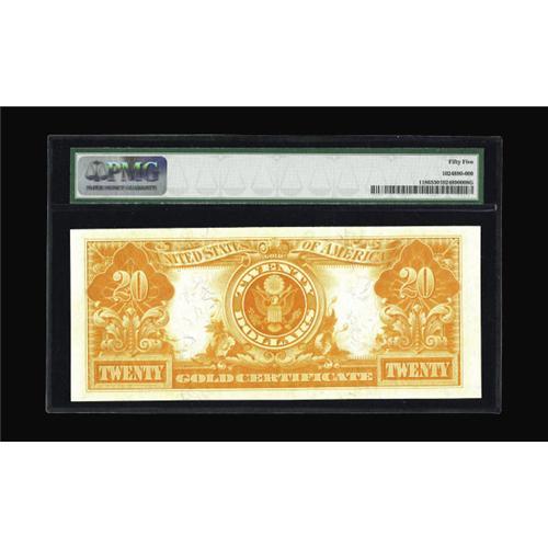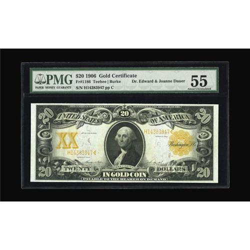 <B>Fr. 1186 $20 1906 Gold Certificate PMG About Uncirculated 55.</B></I> This very handsome 1906 Twenty Dollar Gold, with broad margins, bright colors, ideal centering of both sides and the visual effect of a Superb Gem, photographed on page 301 of the Dauer book. A common type, with over 100 examples known, this is one of the few easily affordable notes in this collection.<BR><I>From The Dr. Edward and Joanne Dauer Collection</B></I>