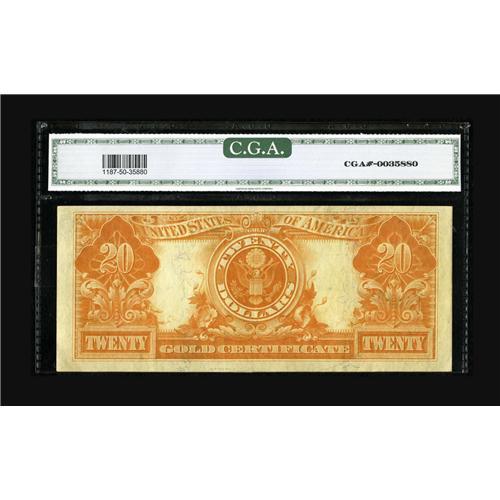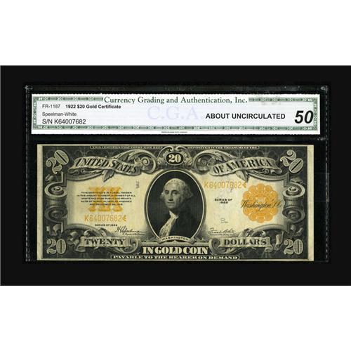<B>Fr. 1187 $20 1922 Gold Certificate CGA About Uncirculated 50.</B></I> A pair of center folds is noticed on this brightly hued orange back.<BR><BR><b>Shipping:</b> Coin/Currency (<a target="_blank" href="http://www.heritageauctions.com/common/shipping.php">view shipping information</a>)