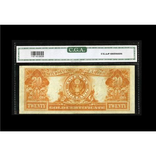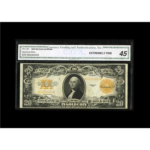 <B>Fr. 1187 $20 1922 Gold Certificate CGA Extremely Fine 45.</B></I> The orange back is quite vivid and the overprints stand out nicely.