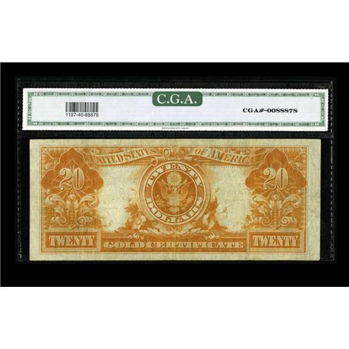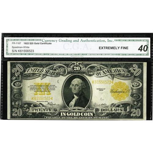 <B>Fr. 1187 $20 1922 Gold Certificate CGA Extremely Fine 40.</B></I> Dark inks are found on this example.