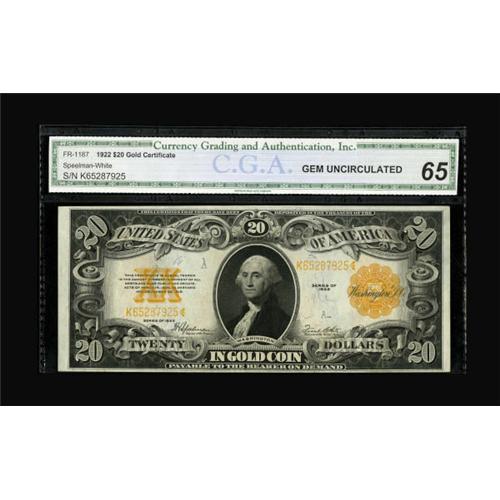 <B>Fr. 1187 $20 1922 Gold Certificate CGA Gem Uncirculated 65.</B></I> A rich overprint and bright paper complement the deeply printed design.<BR><BR><b>Shipping:</b> Coins & Currency (<a target="_blank" href="http://www.heritageauctions.com/common/shipping.php">view shipping information</a>)