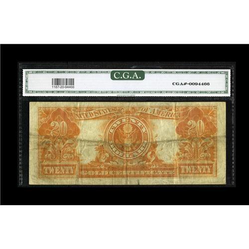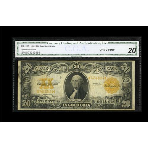 <B>Fr. 1187 $20 1922 Gold Certificate CGA Very Fine 20.</B></I> Creamy paper surfaces remain despite the lightly soiled fold on the back.
