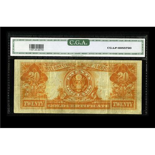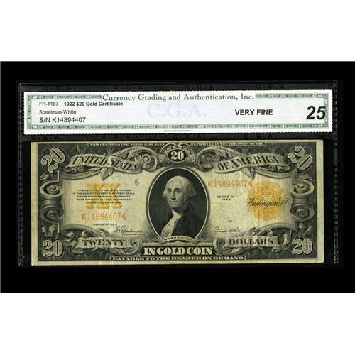 <B>Fr. 1187 $20 1922 Gold Certificate CGA Very Fine 25.</B></I> Problem-free with pleasing color.