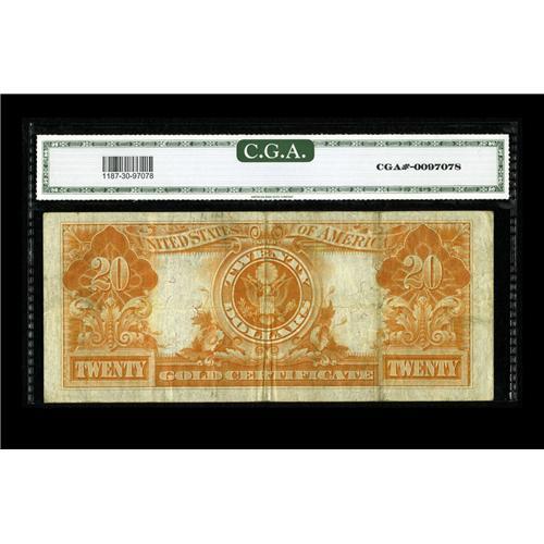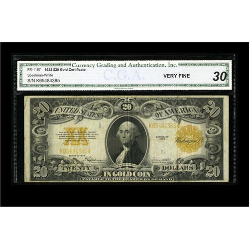 <B>Fr. 1187 $20 1922 Gold Certificate CGA Very Fine 30.</B></I> The back color is bright on this desirable mid grade Gold note.