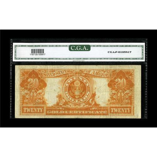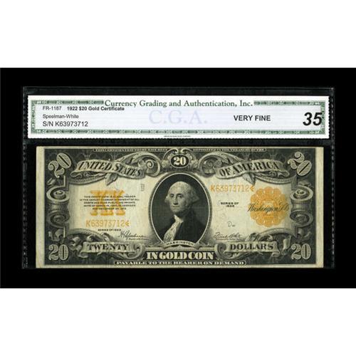<B>Fr. 1187 $20 1922 Gold Certificate CGA Very Fine 35.</B></I> A middle grade Gold Certificate with its grade attested to by CGA.<BR><BR><b>Shipping:</b> Coin/Currency (<a target="_blank" href="http://www.heritageauctions.com/common/shipping.php">view shipping information</a>)
