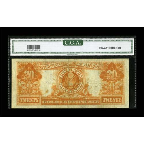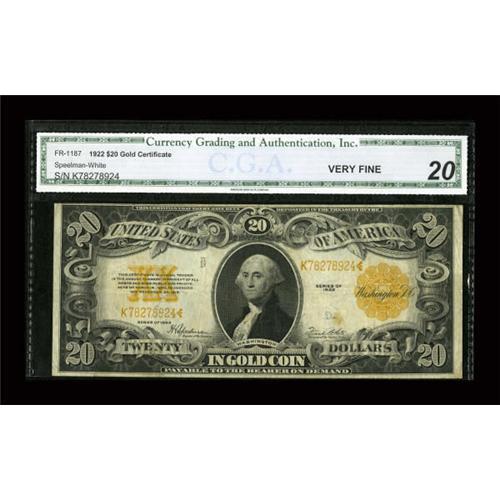 <B>Fr. 1187 $20 1922 Gold Certificate CGA Very Fine 20.</B></I> The overprint and back design remain bright and attractive.<BR><BR><b>Shipping:</b> Coins & Currency (<a target="_blank" href="http://www.heritageauctions.com/common/shipping.php">view shipping information</a>)