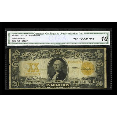 Fr. 1187 $20 1922 Gold Certificate CGA Very Good 10. A Fr. 1187 $20 1922 Gold Certificate CGA Very G